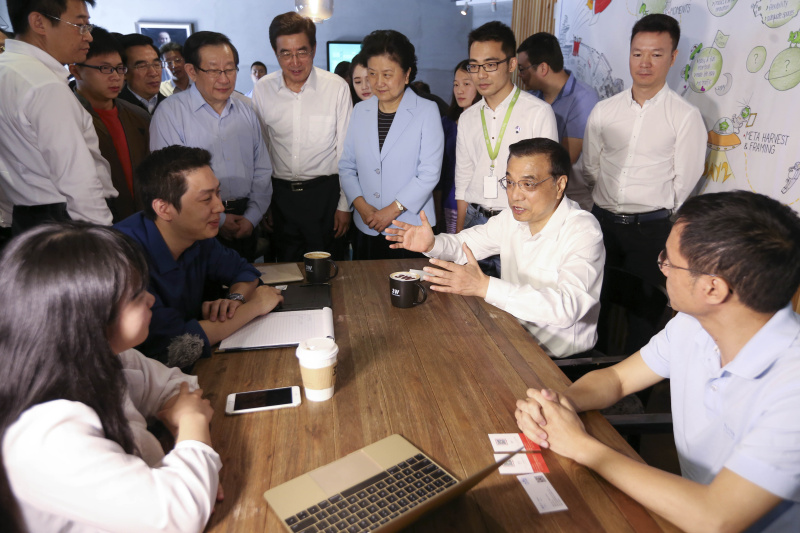 2015年5月7日,李克強(qiáng)來到中關(guān)村創(chuàng)業(yè)大街3W咖啡。他坐下來與年輕人邊喝咖啡邊聊創(chuàng)業(yè)。蜂擁圍攏過來的創(chuàng)業(yè)者爭(zhēng)搶著向總理介紹各自的項(xiàng)目。聽到大家各種奇思妙想的創(chuàng)意,總理感嘆道:“這里精彩紛呈,什么想法都有!真正知道社會(huì)需求的是大眾,這正是大眾創(chuàng)業(yè)的精髓所在。”(資料圖)