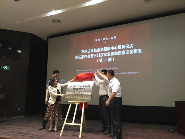 2017年5月24日,由科技部火炬中心、深圳證券交易所、石家莊高新區(qū)管委會(huì)指導(dǎo),石家莊市科技局、深圳證券信息有限公司主辦,石家莊高新區(qū)科技局、中國高新區(qū)科技金融信息服務(wù)平臺(tái)、石家莊市科技創(chuàng)新服務(wù)中心承辦的“石家莊科技金融路演中心揭牌儀式暨石家莊高新區(qū)科技企業(yè)投融資常態(tài)化路演(期)”活動(dòng)在河北舉辦。石家莊科技金融路演中心將為科技型中小企業(yè)提供專業(yè)化、定制化、特色化路演服務(wù),幫助河北省科技企業(yè)解決融資難題,助力京津冀協(xié)同發(fā)展。