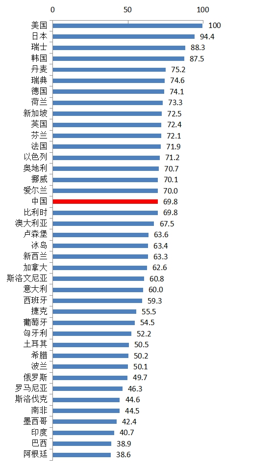 “金磚五國”除中國外,排名均在30名之后。俄羅斯列第33位,處于第三集團(tuán)中的領(lǐng)先位置;南非、印度和巴西在40國中仍處于靠后的位置,分列第36、第38和第39位。