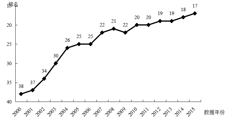 (5)“創(chuàng)新環(huán)境”排名第20位,下降1位。排名下滑的指標(biāo)是“宏觀經(jīng)濟(jì)環(huán)境”、“員工收入與效率掛鉤程度”、“政府采購對(duì)技術(shù)創(chuàng)新影響”,分別排名第6位、第20位和第6位,均比上年下降2位。這表明,在經(jīng)濟(jì)增速下行的背景下,中國創(chuàng)新面臨的市場(chǎng)環(huán)境受到一定程度的影響。但是相比較而言,中國政府對(duì)創(chuàng)新的支持力度仍位居世界前列。
