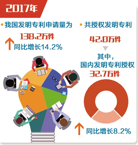 近日,國家知識(shí)產(chǎn)權(quán)局發(fā)布了2017年我國發(fā)明專利有關(guān)情況和企業(yè)排名。數(shù)據(jù)顯示,2017年,我國發(fā)明專利申請(qǐng)量為138.2萬件,同比增長14.2%。共授權(quán)發(fā)明專利42.0萬件,其中,國內(nèi)發(fā)明專利授權(quán)32.7萬件,同比增長8.2%。專利事業(yè)迸發(fā)出量質(zhì)齊升的澎湃動(dòng)力,從知識(shí)產(chǎn)權(quán)大國邁向知識(shí)產(chǎn)權(quán)強(qiáng)國的步伐更加堅(jiān)實(shí)有力。