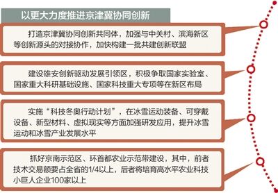 為加速“京津研發(fā)、河北轉(zhuǎn)化”,今年,河北省將以更大力度推進(jìn)京津冀協(xié)同創(chuàng)新。打造京津冀協(xié)同創(chuàng)新共同體,加強(qiáng)與中關(guān)村、濱海新區(qū)等創(chuàng)新源頭的對(duì)接協(xié)作,加快構(gòu)建一批共建創(chuàng)新聯(lián)盟;建設(shè)雄安創(chuàng)新驅(qū)動(dòng)發(fā)展引領(lǐng)區(qū),積極爭(zhēng)取國(guó)家實(shí)驗(yàn)室、國(guó)家重大科研基礎(chǔ)設(shè)施、國(guó)家科技重大專(zhuān)項(xiàng)等在新區(qū)布局;實(shí)施“科技冬奧行動(dòng)計(jì)劃”,在冰雪運(yùn)動(dòng)裝備、可穿戴設(shè)備、新型材料、虛擬現(xiàn)實(shí)等方面加強(qiáng)研發(fā)應(yīng)用,提升冰雪運(yùn)動(dòng)和冰雪產(chǎn)業(yè)發(fā)展水平;抓好京南示范區(qū)、環(huán)首都農(nóng)業(yè)示范帶建設(shè),其中,前者技術(shù)交易額要占全省的1/4以上,后者將培育高水平農(nóng)業(yè)科技小巨人企業(yè)100家以上。
