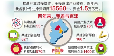 我省加強與中關村、濱海新區(qū)等創(chuàng)新源頭的對接協(xié)作,借力京津產業(yè)優(yōu)勢和科技資源,構建協(xié)同創(chuàng)新共同體,加快推動產業(yè)轉型升級。數(shù)據顯示,近四年來,我省與京津共建各類科技園區(qū)55個、創(chuàng)新基地62個、創(chuàng)新平臺160個、產業(yè)技術創(chuàng)新聯(lián)盟76個,引進轉化科技項目570項,吸引落戶京津高科技企業(yè)1400家。