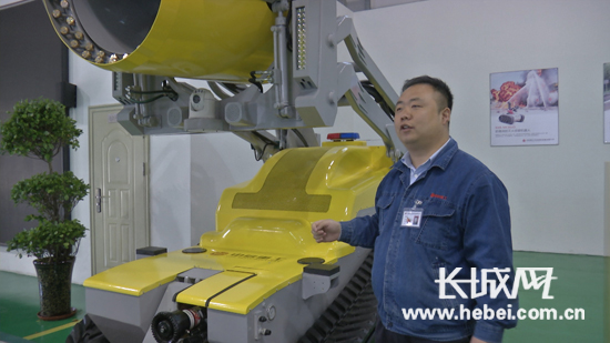中信重工開誠(chéng)智能裝備有限公司機(jī)器人研發(fā)部副經(jīng)理孫寧介紹全國(guó)首臺(tái)消防排煙滅火機(jī)器人。楊雨熹攝