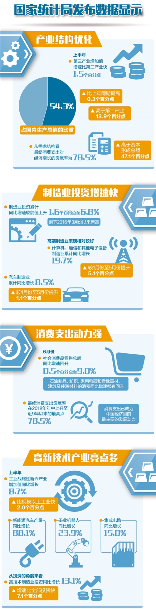 上半年國民經(jīng)濟總體平穩(wěn)、穩(wěn)中向好。其中,消費支出、產(chǎn)業(yè)升級和制造業(yè)投資成為結(jié)構(gòu)調(diào)整中的亮點,為奮力前行中的中國經(jīng)濟提供了穩(wěn)定的支撐。
