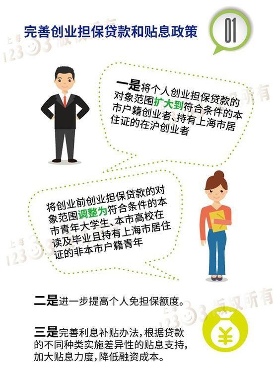 是完善創(chuàng)業(yè)擔(dān)保貸款和貼息政策。一是將個人創(chuàng)業(yè)擔(dān)保貸款的對象范圍擴大到符合條件的本市戶籍創(chuàng)業(yè)者、持有上海市居住證的在滬創(chuàng)業(yè)者;將創(chuàng)業(yè)前創(chuàng)業(yè)擔(dān)保貸款的對象范圍調(diào)整為符合條件的本市青年大學(xué)生、本市高校在讀及畢業(yè)且持有上海市居住證的非本市戶籍青年。二是進一步提高個人免擔(dān)保額度。三是完善利息補貼辦法,根據(jù)貸款的不同種類實施差異性的貼息支持,加大貼息力度,降低融資成本。