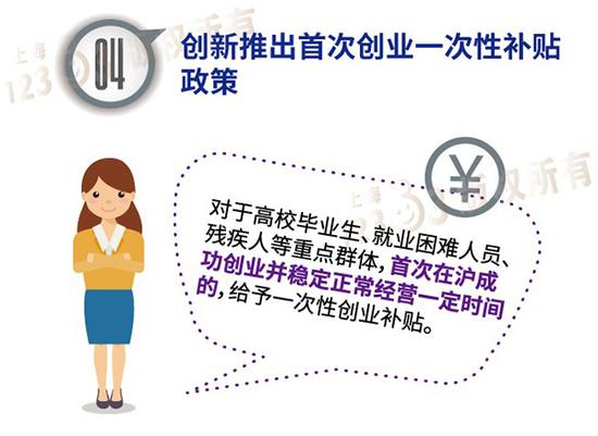 第四是創(chuàng)新推出首次創(chuàng)業(yè)一次性補貼政策。對于高校畢業(yè)生、就業(yè)困難人員、殘疾人等重點群體,首次在滬成功創(chuàng)業(yè)并穩(wěn)定正常經(jīng)營一定時間的,給予一次性創(chuàng)業(yè)補貼。