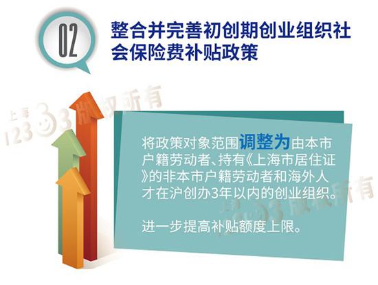 第二是整合并完善初創(chuàng)期創(chuàng)業(yè)組織社會保險費補貼政策。將政策對象范圍調(diào)整為由本市戶籍勞動者、持有《上海市居住證》的非本市戶籍勞動者和海外人才在滬創(chuàng)辦3年以內(nèi)的創(chuàng)業(yè)組織,進一步提高補貼額度上限。
