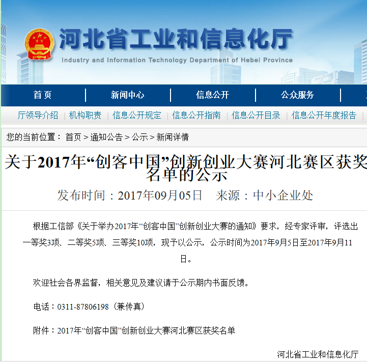 近日,河北省工信廳公布2017年“創(chuàng)客中國”創(chuàng)新創(chuàng)業(yè)大賽河北賽區(qū)獲獎名單,園區(qū)企業(yè)河北唯沃環(huán)境工程科技有限公司的“工業(yè)煙氣多種污染物深度凈化技術”獲得河北賽區(qū)三等獎的好成績。